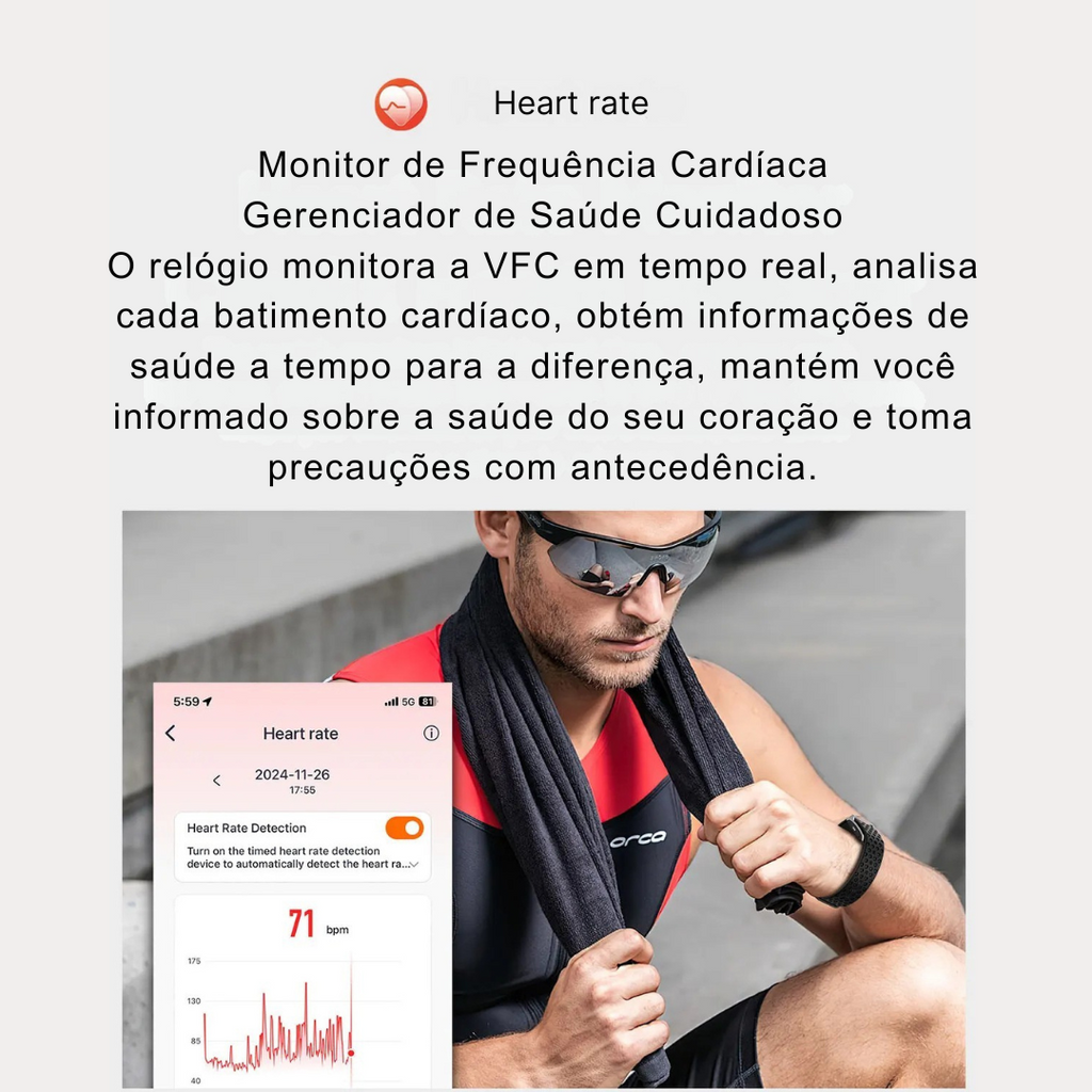 Saúde 24H no Controle: Monitore frequência cardíaca, pressão arterial e oxigênio no sangue continuamente. Tenha uma visão clara da sua saúde a cada segundo.