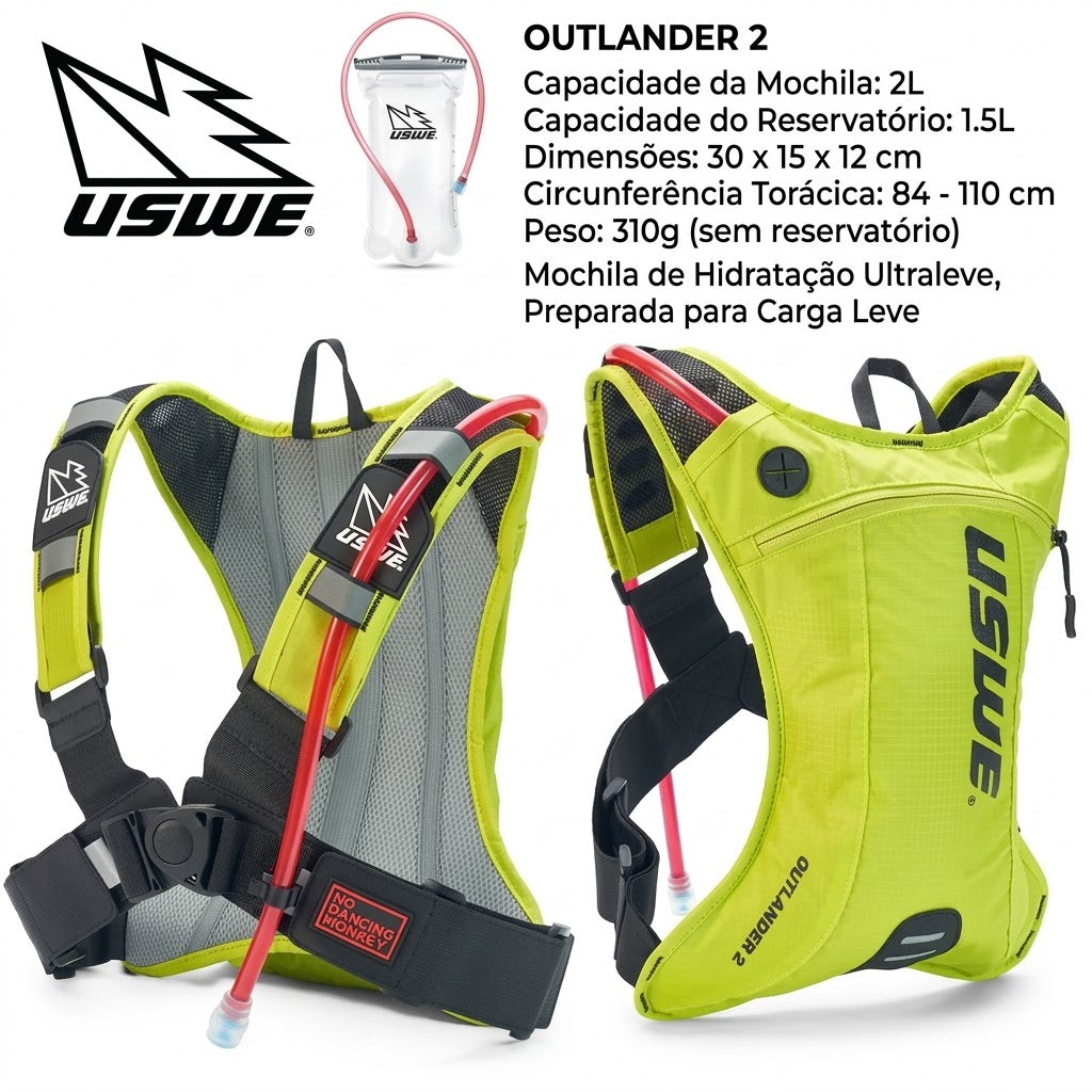Para manter o ciclista hidratado, a mochila de hidratação Uswe Outlander foi projetada para carregar reservatório de hidratação de até 2 L, ele já vem com capacidade de 1,5 litro para ciclistas profissionais de longas distâncias. Mas ela se encaixa a qualquer ciclista que esteja procurando uma excelente mochila de hidratação mantendo a água com temperatura constante e sem esquentar.
